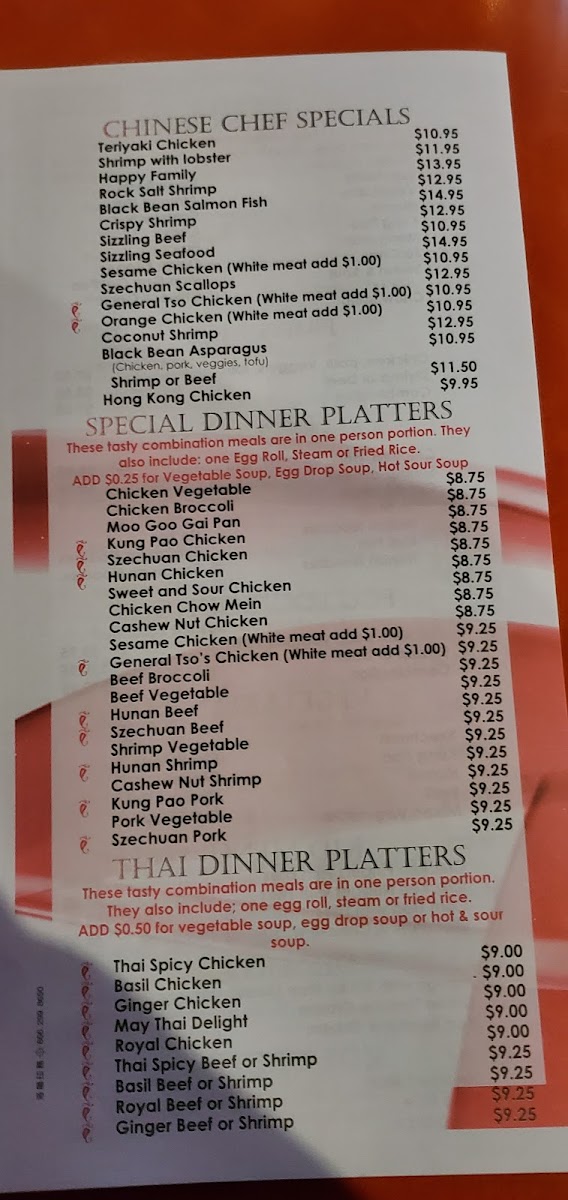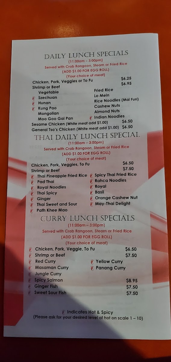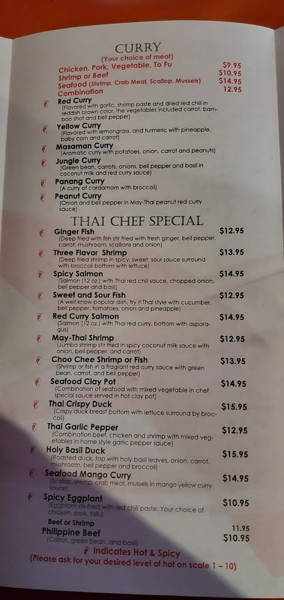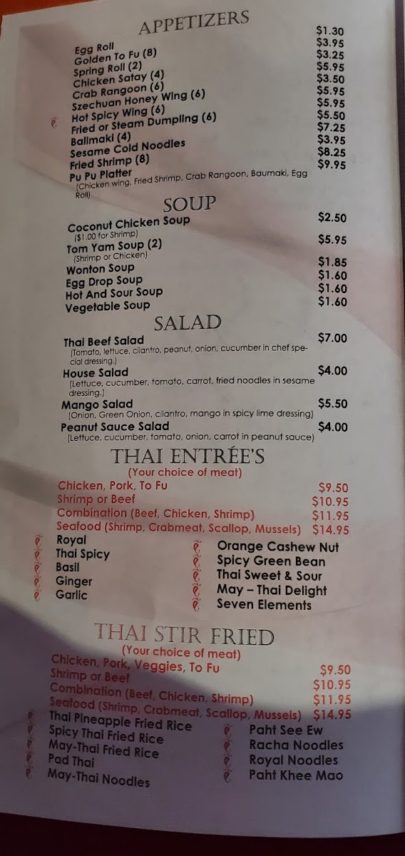 At May-Thai, you’ll find a vibrant menu filled with all the authentic Thai flavors you crave. From the rich, aromatic curries to the fresh, zesty salads, there’s something to satisfy every taste. Whether you’re in the mood for a comforting bowl of Tom Yum or craving something bold like Pad Thai, May-Thai Menu offers a wide variety of dishes that bring together fresh ingredients and traditional recipes. You’ll also find an assortment of delicious stir-fries, noodle dishes, and rice specialties, perfect for sharing or enjoying on your own. The menu is designed to highlight the best of Thai cuisine, with each dish carefully crafted to deliver a balance of spicy, sweet, salty, and sour flavors. Whether you're a seasoned Thai food lover or trying it for the first time, there's always something to tempt your palate at May-Thai.