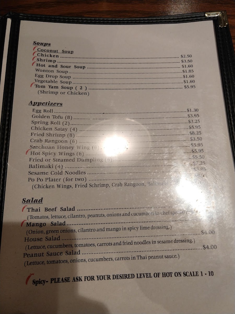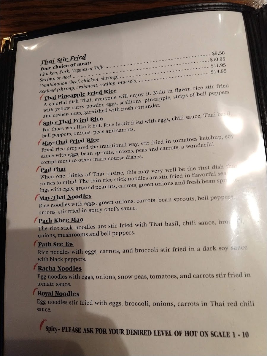 Spicy. When one thinks of Thai cuisine, this may very well be the first dish that comes to mind. The thin rice stick noodles is stir fried in flavorful seasonings with egg, ground peanut, green onion and fresh bean sprout.